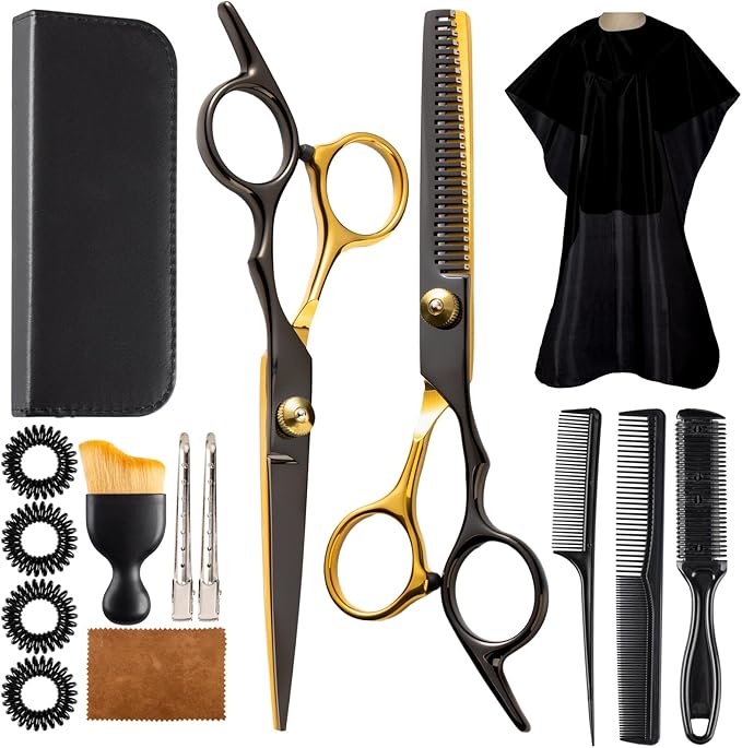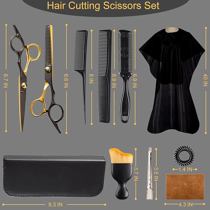 - What You Get: 15 pcs Hair cutting Scissors Professional include: Hair comb, Hair razor comb, Long tail comb, Iron barrette X 2, Black Gold Hair scissors, Black Gold Thinning scissor, Black bag, Hair band X 4, Cleaning cloth, Hair brush, Barber cape