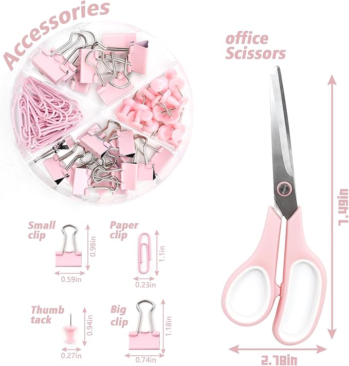- What’s Included - You will receive 1x 360°rotating pink pen holder, 1x pink stapler, 1x pink tape dispenser, 1x office scissors,1x Staple Remover,1x Tape,20 x Push pins 7 x Big Clips 15 x Small Clips 30 x Paper Clips,1000 staples,and 1x 50pcs pink transparent sticky notes.Such a complete pink desk accessories combination is enough to meet your school and office using needs.