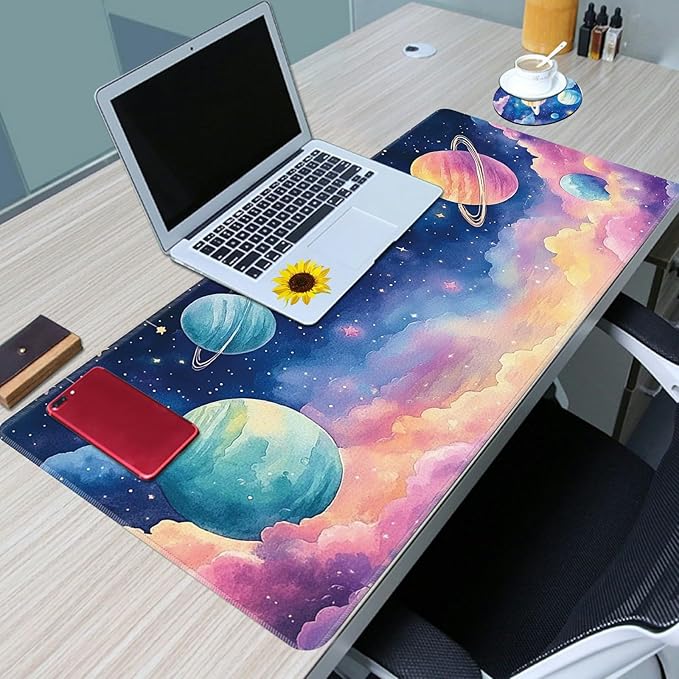 Desk Mat Large Gaming Mouse Pad (31.5x11.8 inch) with Stitched Edges, XL Mouse Pad +Coaster, Extended Mouse Mat Keybroad Mousepad Non-Slip Rubber for Gamer Men Women, Colored Nebula Planet