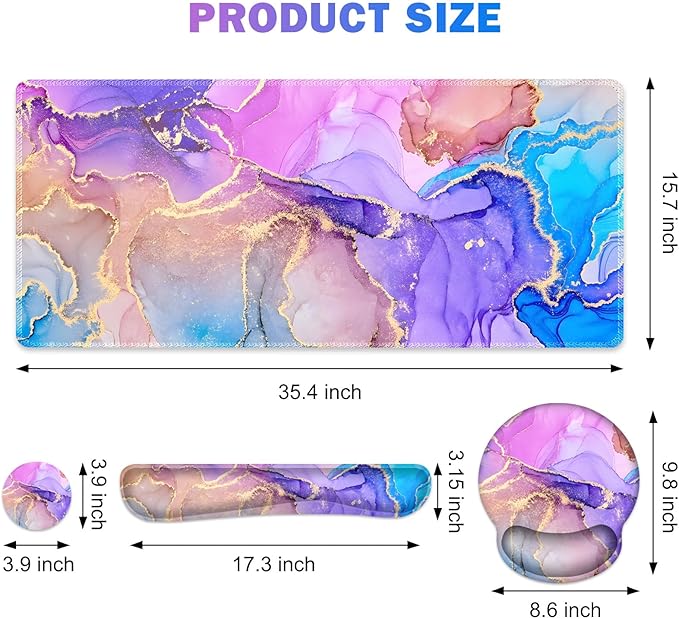 Gaming Mouse Pad, Large Desk Mat, Cute Desk Pad Protector, 4in1 XXL Mousepad + Keyboard Wrist Rest+Mouse Wrist Rest+Coaster Set with Ergonomic Desk Pad for Home Office PC Computer, Colorful Marble