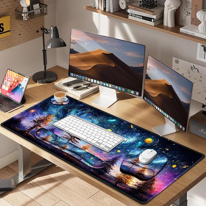 - 【Premium Materials and Workmanship】 The mouse pad with wrist rest and keyboard pad was printed by advance technology, covered by the superfine fabric. A keyboard and mouse pad has a soft and smooth surface, maximally enhances your gaming/working experience. Delicate double stitched edges protect the desk mat from wear, deformation. Environmental, non-toxic and safe to use.