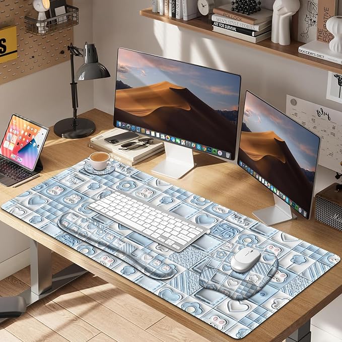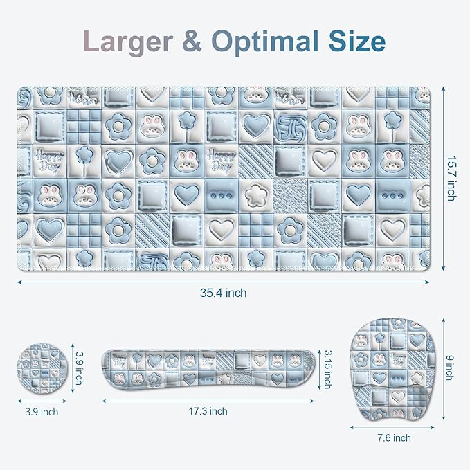 4 in 1 Large Mouse Pad, Keyboard Wrist Rest Set, Ergonomic Mouse Pad with Wrist Support, Desk Mat with Stitched Edges Extended Desk Pad Waterproof Desk Mat for Home Office Game I Cute Rabbit Baby Blue