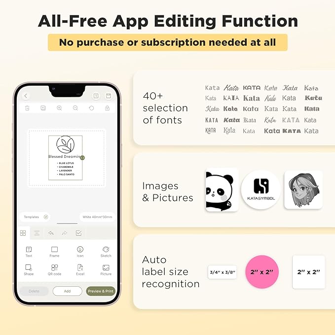 - Versatile App Editing Function: Easily add images from your phone or tablet; customize your labels with 40 fonts, 30 frames, and 450+ icons; all free to use