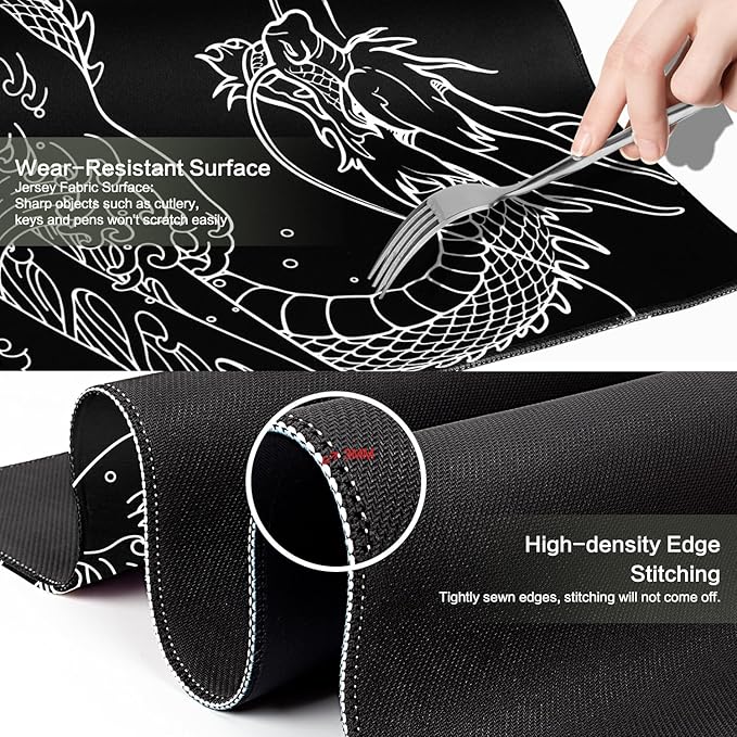 Dragon Mouse Pad Desk Mat Japanese Sea Wave Large Gaming Mouse Pad Anime Desk Pad Mousepad XXL Extended Keyboard Mat Black Mouse Mat, Waterproof, 31.5x15.7 in