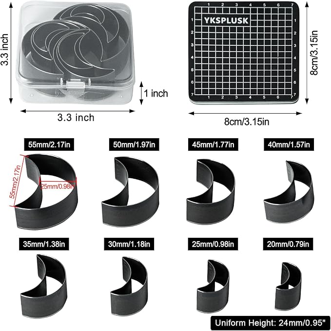 - 【Versatile Moon Shape Cutter Set】This package includes 8 pieces Moon Shape holes in 8 different sizes. Diameter: 20mm(0.79"), 25mm(0.99"), 30mm(1.18"), 35mm(1.38"), 40mm(1.58"), 45mm(1.77"), 50mm(1.97") and 55mm(2.17"); Height: 24mm(0.94"); Thickness: 0.71mm(0.028").