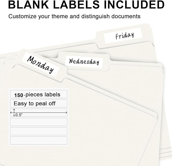 - PACKAGE INCLUDED: This bulk pack includes 150 letter size file folders (50 of each position) and 150 blank labels, idea for any home, office, or school project, providing you with plenty of storage space for all of your important documents