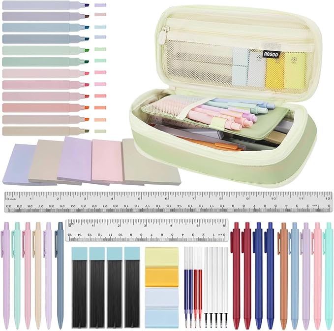 52 Aesthetic School Supplies with Cute Pen Case,5 Black, 2Blue,2 Red Ink Gel Pens,12inch and 6inch rulers,6 Mechanical Pencils for Students Stationary College Essentials