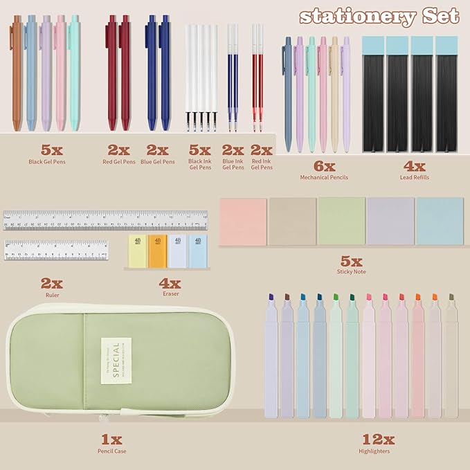 - Comprehensive Stationary Set: This package includes 12 pastel-colored highlighters, 6 adorable automatic pencils, 4 tubes of 0.5mm lead refills, 9 ink gel pens, 9 gel pen refills, a cute pencil case, 5 packs of sticky notes, 4 erasers, and 2 rulers. It is the ultimate collection of multifunctional stationery essentials for office and school use.