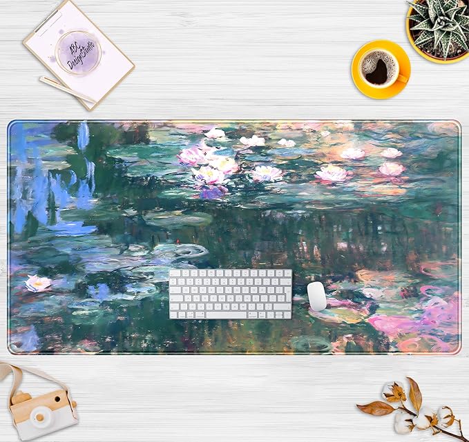 Abstract Oil Painting Mousepad Retro Water Lilies Desk Mat, XXL Large Extended Mouse Pad Gaming, Computer Laptop Keyboard and Mouse Mat, Floral Desk Pad with Stitched Edge, 31.5''x15.7''