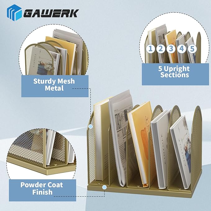 5-Section Vertical Desktop Organizer, 5-Section Mesh File Folder Stand Sorter for Office Home Classroom Organization (1, Gold)