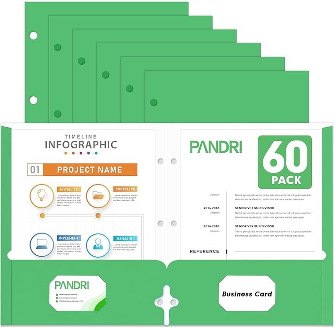 Two Pocket Portfolio Folders, PANDRI 60 Pack 3 Hole Punched 2 Pocket Folders for 3 Ring Binder, Letter Size Paper File Folder for School Office Home Business, Green