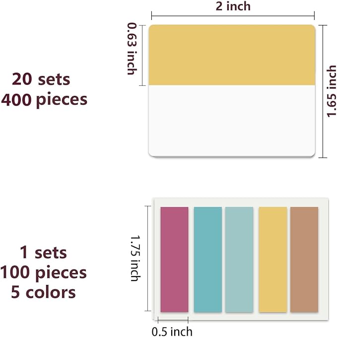 - 500 pieces Book Tabs: 500 pieces 21 sets in total, 400 pieces 2 inch sticky tabs in 20 sets with 10 different pastle colors,100 pieces 0.5 in tabs in 1sets, 20 pieces each color