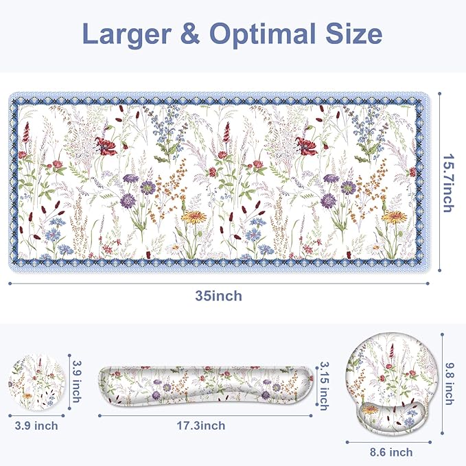 Floral Desk Mat, 4in1 Large Mouse Pad with Wrist Rest, Cute Desk Matt for Desktop, Desk Pad Mat, Anti-Slip XXL Computer Ergonomic Mousepad with Wrist Support for Keyboard and Mouse I Colorful Weeds