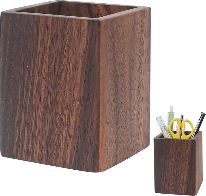 Wooden Pencil Holder for Desk, Wood Pen Black Walnut Cup Holder Square Handwork Natural Organizer Simple Stand for Pencils Make up Brushes Stationery Desks Offices Desk Desktop Decoration (Brown)