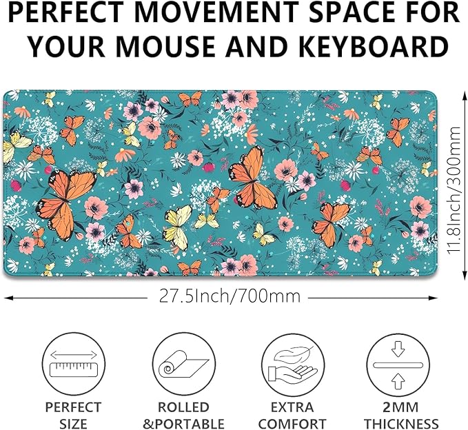 Colorful Butterflies and Flowers Extended Desk Pad Mouse Pad,Stitched Edges Non-Slip Rubber Base XL Mouse Mat Desk Mat for Office Home Work Blue Mousepad(27.5X11.8 Inch)