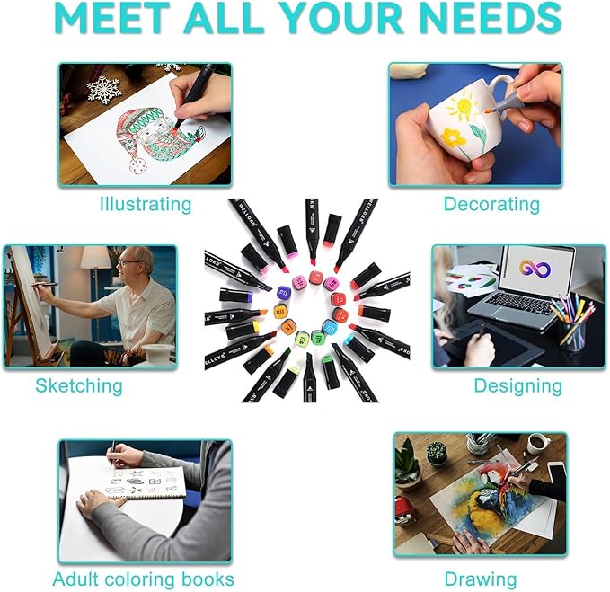 - Dual Tip Markers: WELLOKB alcohol based markers feature a Fine tip (0.5-2 mm) and a Broad tip (2-7 mm) for both detailed strokes and bold coloring. Ideal for sketching, drawing, and adult coloring books, they offer excellent versatility and smooth blending.