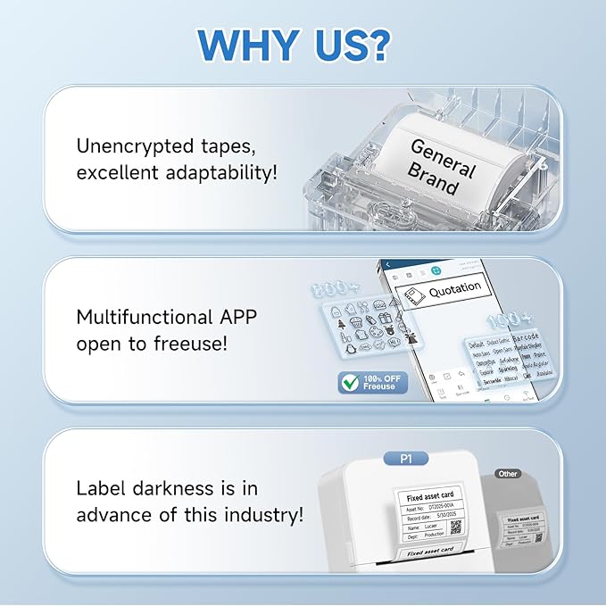 - Save Money: Unencrypted Labels. DETONGER P1 sticker machine can adapt to various kinds of label paper,customer no need to spend extra money on expensive encrypted labels to use our labeler
