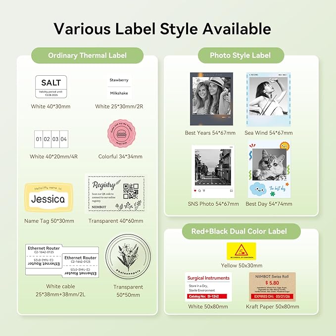 - 【Photo and Color Printing Label】In addition to the regular white, color and clear labels, we have developed a photo style label which can be used as stickers on scrapbook, cards in wallets or bookmarks in books, and red&black dual color label that you can highlight important information in red.