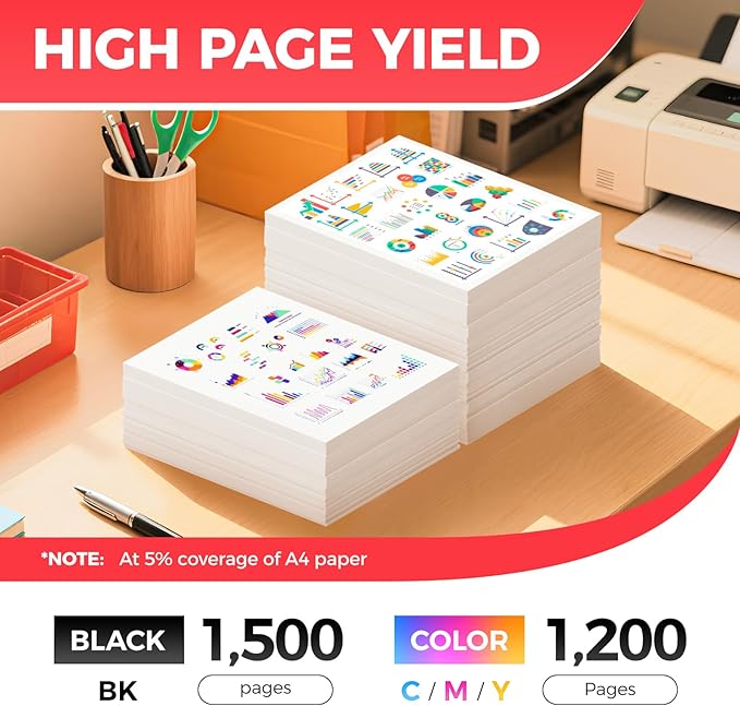 - High-Yield: up to 1,500 pages per 054/054H Black and 1,200 pages per 054/054H Color (Total 5,100 pages, 5% coverage)