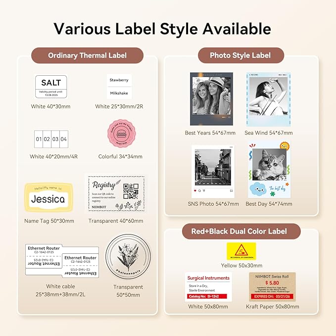- 【Photo and Color Printing Label】In addition to the regular white, color and clear labels, we have developed a photo style label which can be used as stickers on scrapbook, cards in wallets or bookmarks in books, and red&black dual color label that you can highlight important information in red.