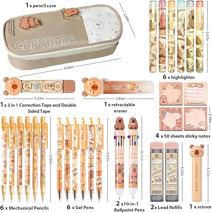 - CUTE STATIONARY: capybara stationery set include 6 x Mechanical Pencils with Erasers, 2 x Mechanical Pencil Lead Refills, 1 x Retractable eraser, 1 x 2 in Correction Tape and Double Sided Tape Roller, 6 x Gel Pens, 2 x 10-in-1 Retractable Ballpoint Pens ,6 x Highlighters, 1 x Scissors,1 x pencil storage box, 200 sheets sticky memos notes, Sufficient quantity and good combination can fully meet your daily use.