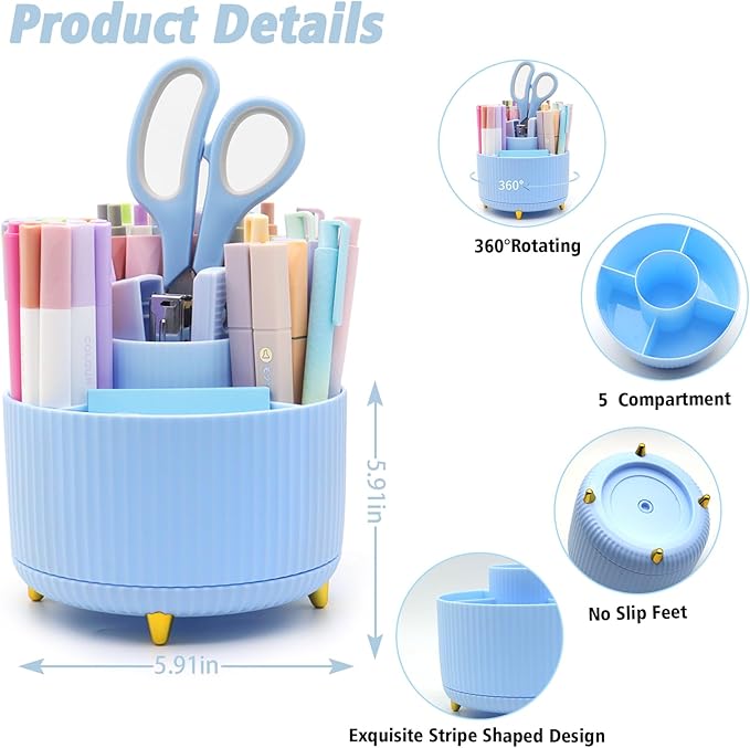 - Intelligent All-Round Rotation Structure - Our Blue pen holder set has the function of 360 degree free rotation.With five compartments, the pen holder for desk provides ample storage without taking up too much desktop space. This pencil holder for desk is ingeniously designed to allow you to place various small items in easily accessible locations, while ensuring that it does not interfere with the use of your space. You can always quickly and conveniently obtain the items you need.