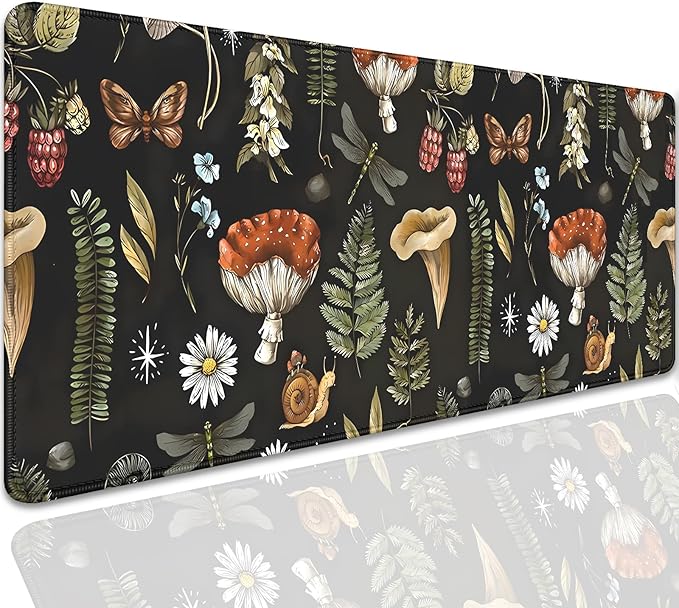 Plant Mushroom Desk Pad Mouse Pad,Large Black Aesthetic Mouse Mat with Stitched Edges,Non-Slip Rubber Base Mousepad for Office PC Keyboard Laptop and Home Work Desk Mat(27.5X11.8 in)