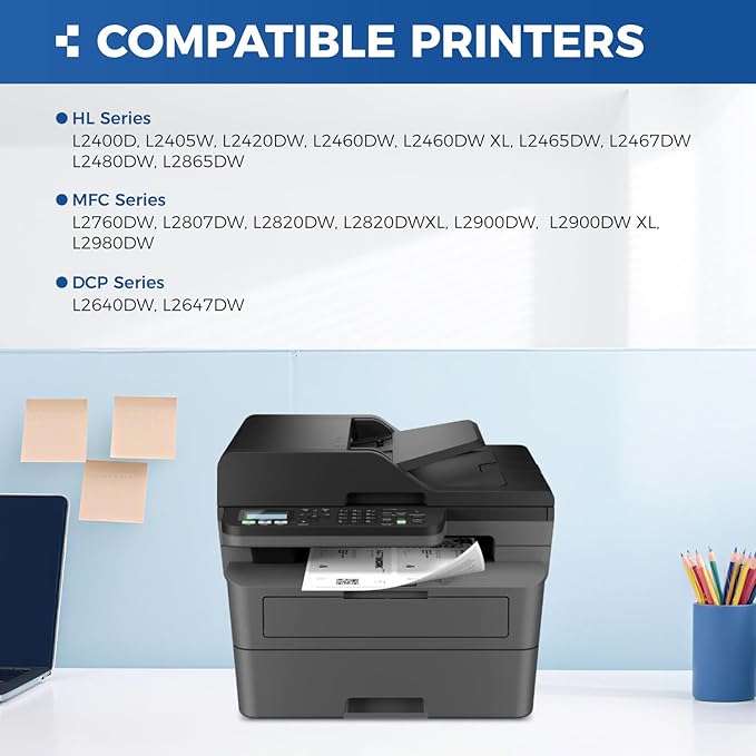 - Compatible Printer: Compatible with Brother HL-L2400D, HL-L2405W, HL-L2420DW, HL-L2460DW, HL-L2465DW, HL-L2467DW, HL-L2480DW, HL-L2865DW, HL-L2460DW XL, MFC-L2760DW, MFC-L2807DW, MFC-L2820DW, MFC-L2820DW XL, MFC-L2900DW, MFC-L2900DW XL, MFC-L2980DW, DCP-L2640DW, DCP-L2647DW (Please check that your printer model matches the printer model of this toner cartridge before placing an order).