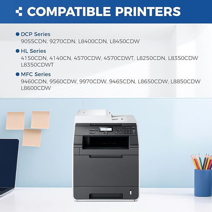 - Compatible Printer: Compatible with Brother DCP-9055CDN, DCP-9270CDN,DCP-L8400CDN, DCP-L8450CDW, HL-4150CDN, HL-4140CN, HL-4570CDW, HL-4570CDWT, HL-L8250CDN, HL-L8350CDW, HL-L8350CDWT, MFC-9460CDN, MFC-9560CDW, MFC-9970CDW, MFC-9465CDN, MFC-L8650CDW, MFC-L8850CDW, MFC-L8600CDW (Please check that your printer model matches the printer model of this toner cartridge before placing an order).