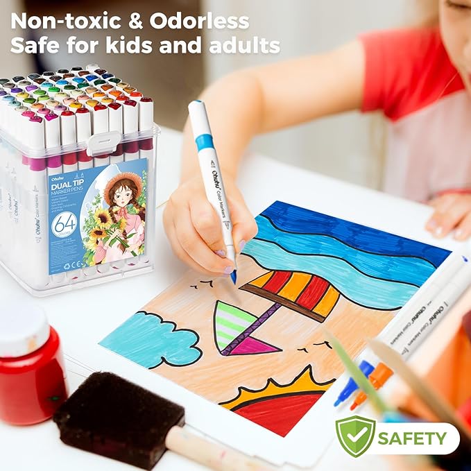 Ohuhu Water-based Markers for Adult Coloring Books No Bleeding 64 Colors Dual Tips Coloring Markers for Kids Adults Beginners Drawing Pens for Journaling Lettering (Brush & Fine)