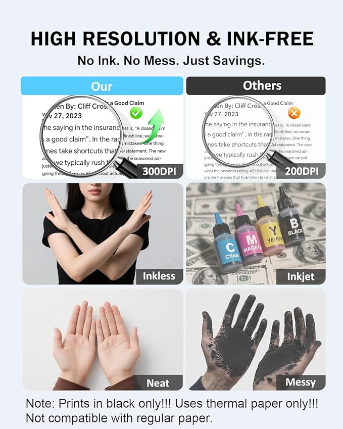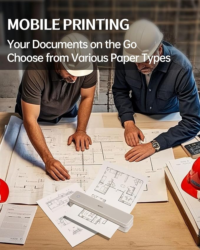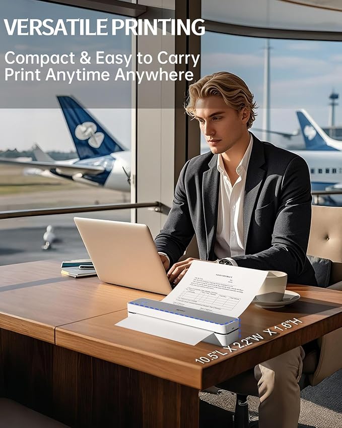 - ✅ Ultra Light Travel Printer– At just 1.1lb (526g) and 1.6 inches thick, this portable thermal printer fits easily into your backpack or work bag. Whether you're on a business trip, campus, café, or coworking space, print contracts, lecture notes, or documents on the go—no desk needed!