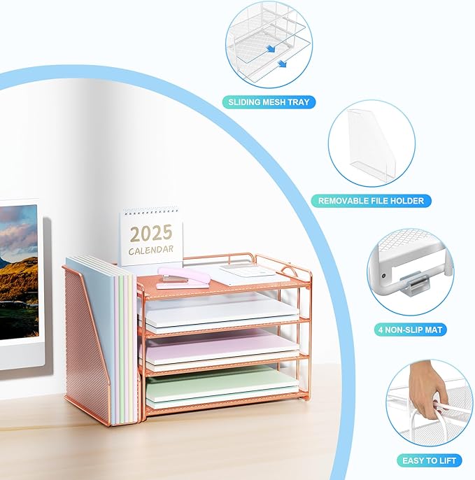 - ▶ Save desktop space: The office desk organizer provides you with 4 paper trays and a vertical file organizer, providing ample space for your desktop and helping to keep your desktop organized and free of clutter.
