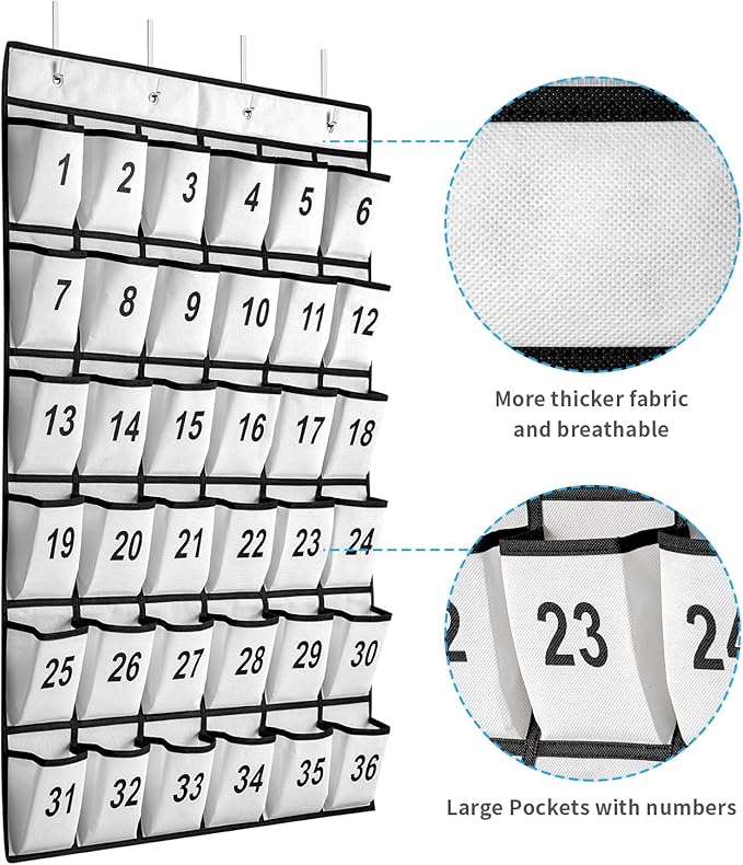 - 【Easy to Hang】There are 4 stainless steel hooks for the 36 numbered pockets chart for classroom, strong and adjustable. suitable for doors with thicknesses from 1.37 to 1.97 inches.it is easy to hang and save classroom space.you can hang it in classroom,home, office, child-care centre, preschool or anywhere you want.