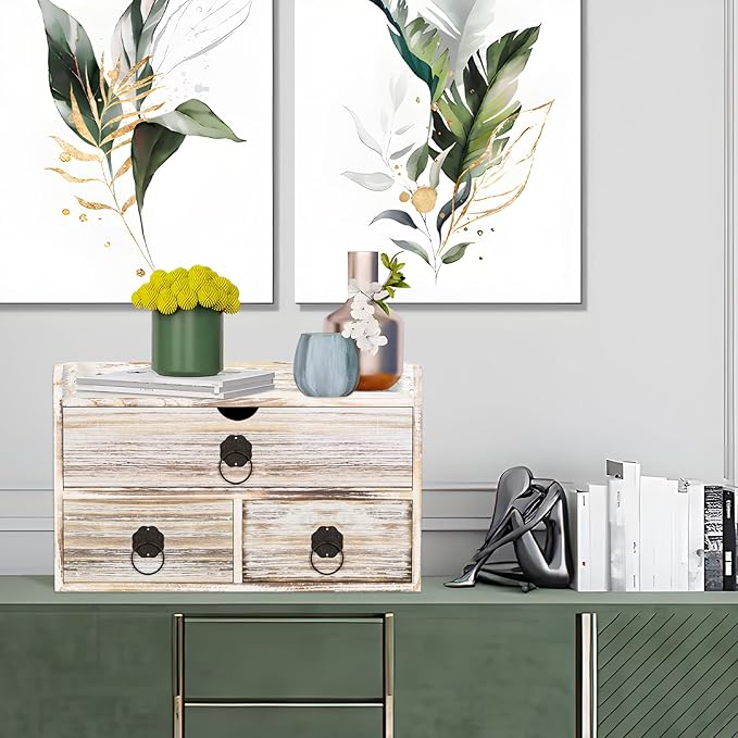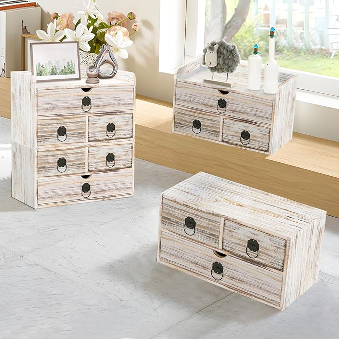 - Stunning Design: This vintage wood desktop organizer combines style and functionality with 1 large drawer, 2 small drawers and top divider, built-in baffles, 4 non-slip feet, and durable fir wood construction. The farmhouse charm fits in with any decor, keeping essentials organized in the office, bedroom, or kitchen — no assembly required.
