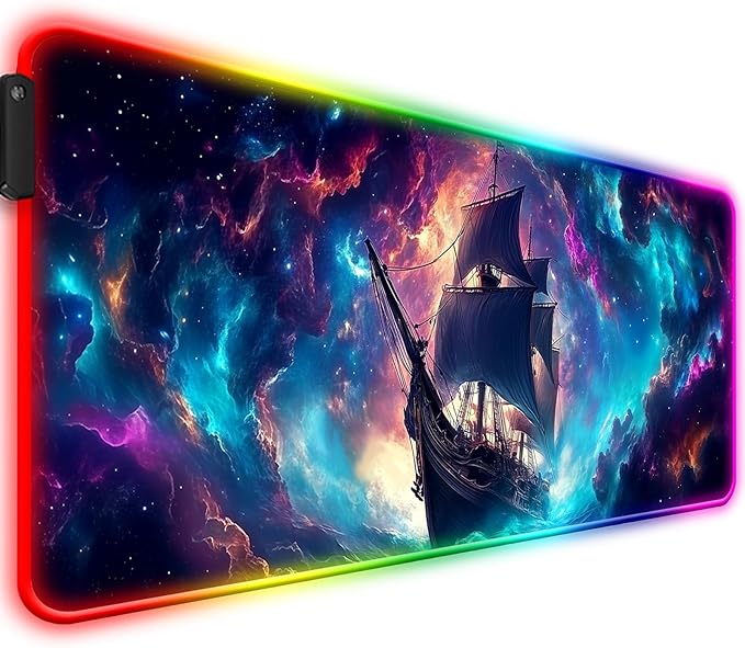 RGB Fantasy Pirate Ship Gaming Desk Mat, Computer Keyboard Large Extended Long LED Mouse Pad for Office and Home, XL (W01)