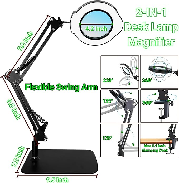 - ✅ Flexible Swing Arm & Hands-Free Operation – Equipped with two adjustable metal arms, three knobs, and four springs, allowing precise positioning of the lens and light exactly where needed. Perfect for jewelry making, soldering, esthetics, painting, sewing, reading, and other detailed work, making it the ultimate hands-free magnification solution.