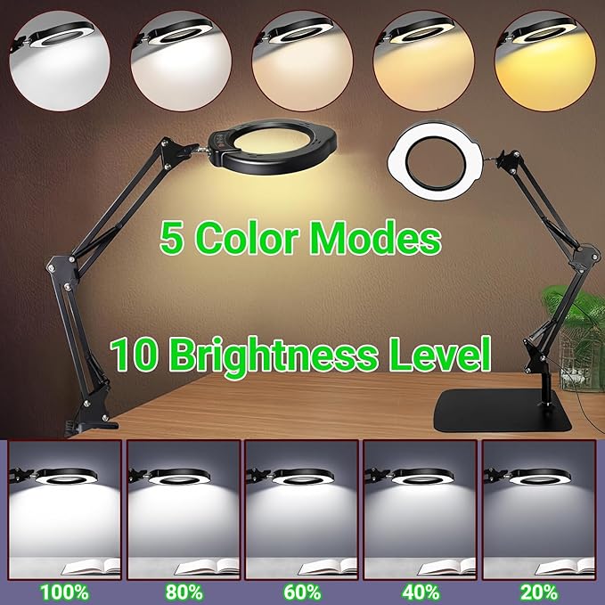 - ✅ Adjustable Lighting with 5 Color Modes & Dimmable Brightness – Customize your lighting with five adjustable color temperatures from warm to cool tones and stepless dimming (10%-100%). This flicker-free, glare-free illumination reduces eye fatigue and enhances visibility, ideal for painting, embroidery, modeling, and other close-up hobbies.