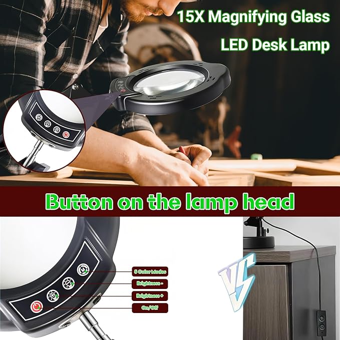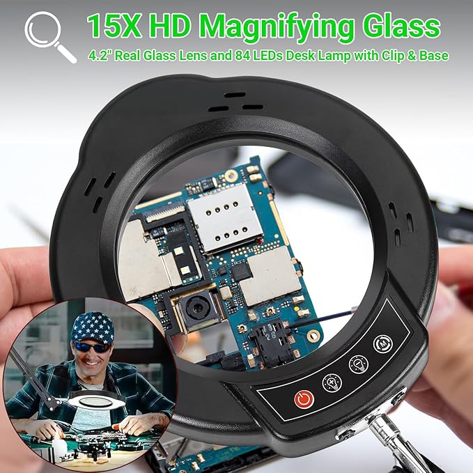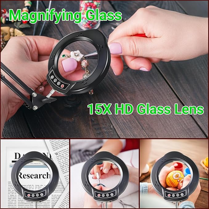 - ✅ 15X High-Definition Real Glass Lens – Features a 4.3-inch distortion-free real glass lens that delivers crystal-clear 15X magnification with a large viewing area. Unlike plastic lenses, it ensures no edge blurring or distortion, making it perfect for intricate tasks like crafting, reading, and precision work without causing dizziness or eye strain.