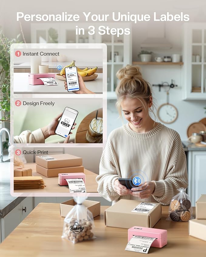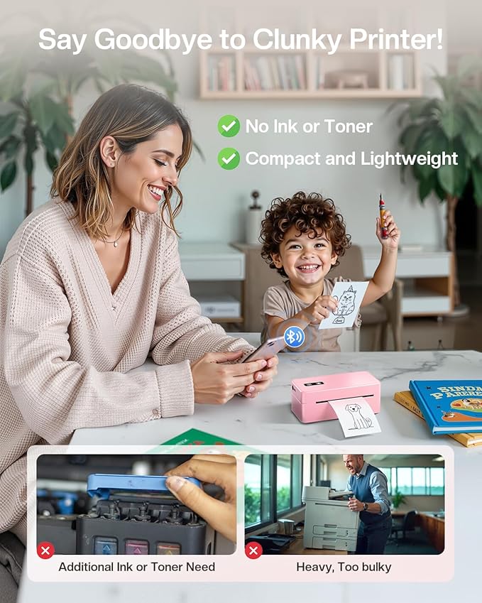 - 【Fashionable and Compact Design】The 2410BT label printer has a pink appearance design which looks cuter and more lively. The distinctive label printer will add charm to your workspace.The 2025 new upgrade 2410BT shipping label printer is ultra compact and lightweight, measuring 6.62"D x 2.93"W x 2.61"H and weighting only 441g. The thermal printer revolutionize your workspace. It takes up very little desk space to print, keeping your workspace clean and tidy; In addition, this thermal label printer is only palm-sized so that you can fit into a backpack and print anywhere.