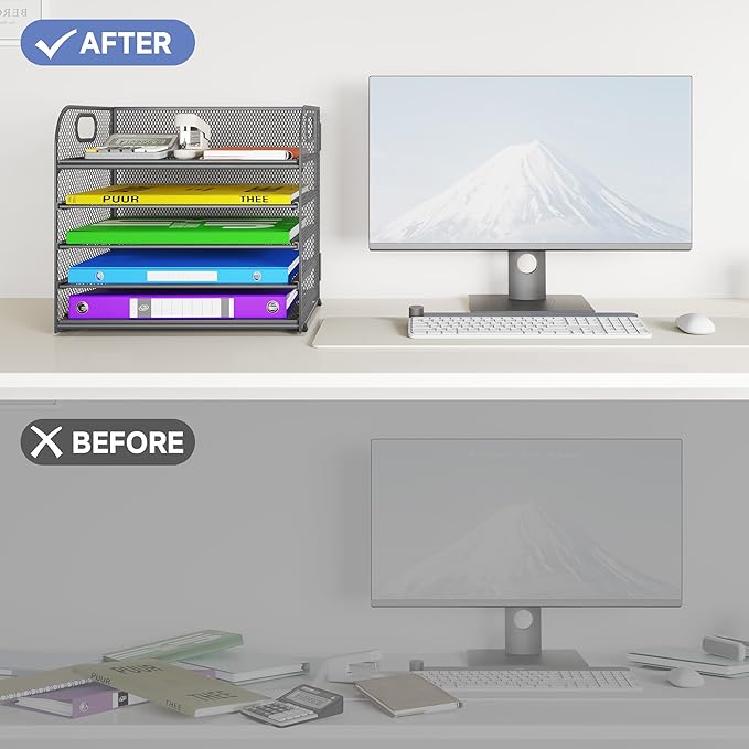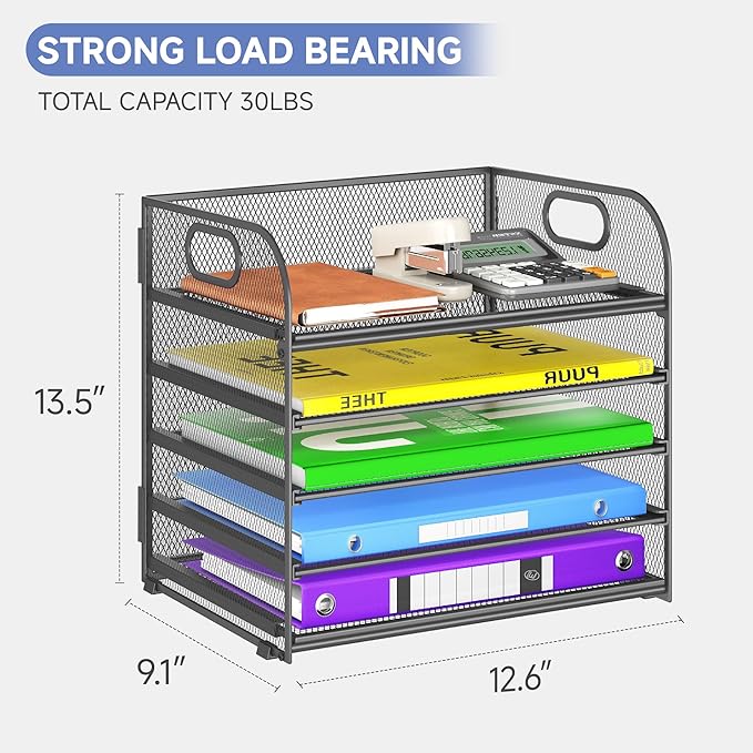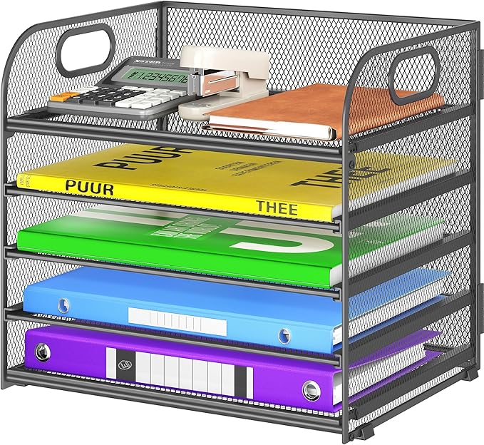 - 【EFFICIENT DESK ORGANIZER】Keep your desk tidy and clutter-free with our 5-Tier Paper Organizer with Handle. This file organizer provides ample space for sorting and storing papers, letters, documents, folders, books, magzines, staplers, caculators and sticky notes.