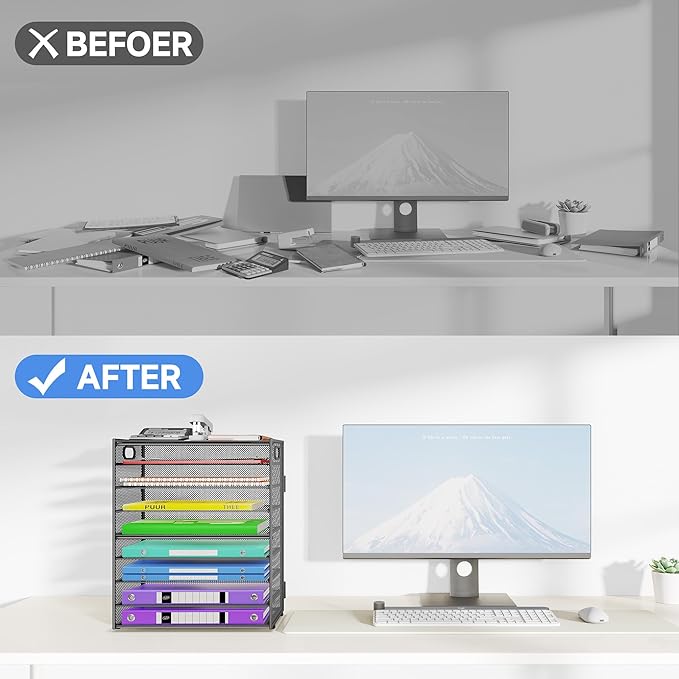 - 【EXTRA-LARGE STORAGE CAPACITY】Our 9-tier paper organizer offers more storage space than low-capacity file organizers, allowing you to sort and store more papers, letters, documents, folders, books, magazines, staplers, calculators, and sticky notes. Keep your workspace tidy and organized!