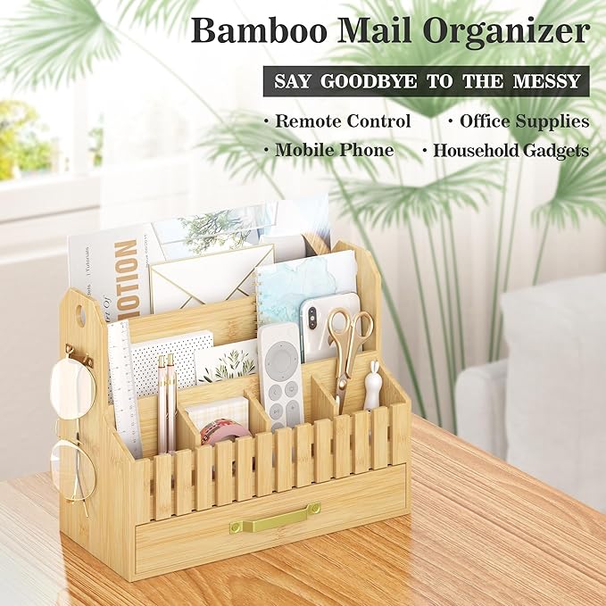 Bamboo Mail Organizer Countertop with Drawers, Wood Desk File Organizer Desktop Paper Organization Storage Bill & Letter Sorter Holder for School Home Office Supplies, No Assembly Required (Nature)