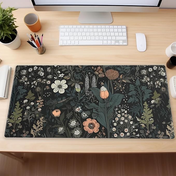 Dark Floral Desk Pad Mat, Extended XL Large Gaming Mousepad with Stitched Edges, Non-Slip Computer Mat Pad for Desk, Keyboard and Mouse mat 31.5 x 15.7 in