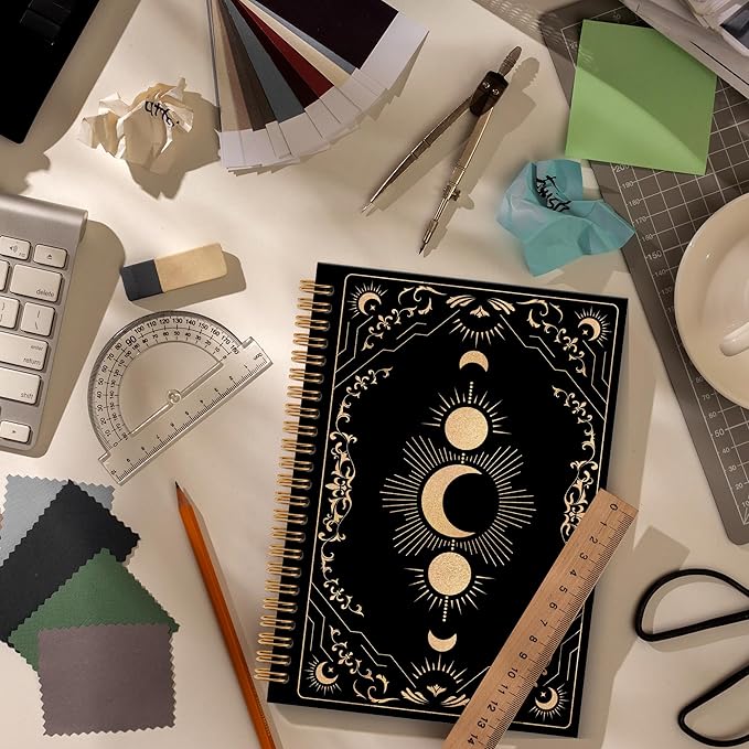 Black Witchy Moon Notebook Journal, Celestial Spiral Notebook, Moon Journal, Black and Gold MoonPhase Notebooks Gifts for Tarot Lovers Women Men, Witchy Gothic School Office Supplies, 6x8.2In