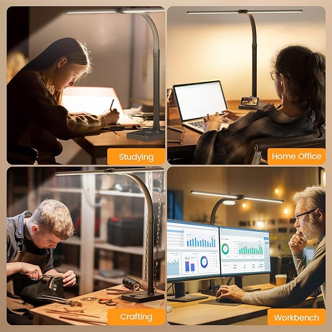 - 【Flexible & Wide Lighting Coverage】 Our double head desk light, made of soft metal and aluminum material; the gooseneck is bendable to adjust height, the 2 light bars can be opened from 0-180°, the light can cover the whole desk.