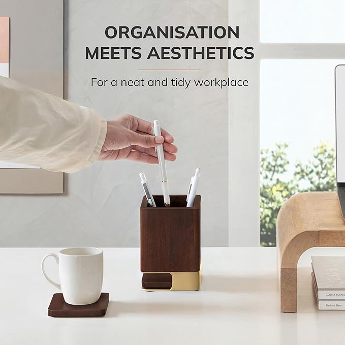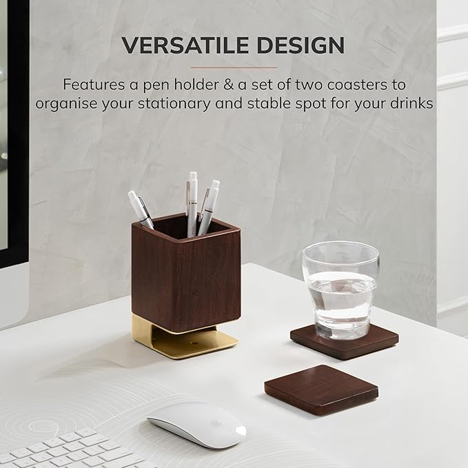 - Elegant Desk Accessories: Crafted from sustainable mango wood, this wooden pen cup and coasters set enhances office desk accessories with its sleek design, offering a refined touch to any office desk environment.