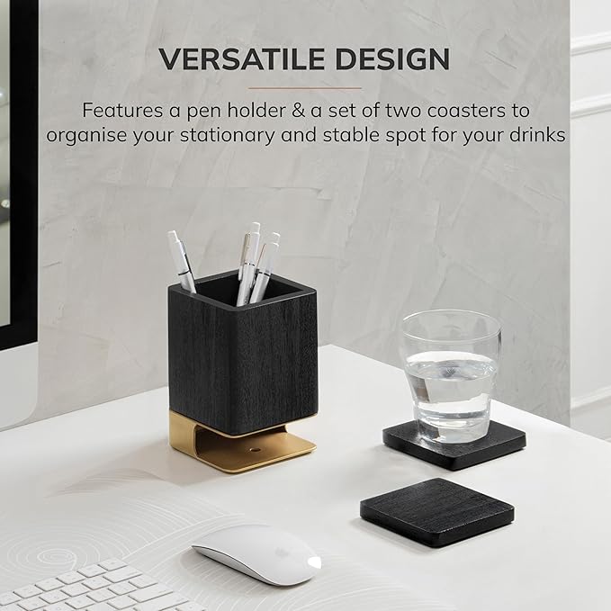 Anji Mountain Mango Wood Pen Holder with 2 Coasters, Stained Wood & Powder Coated Metal Pen Holder, Sustainable Room Decor Desk Organizer, Stylish Designer Pencil Case for Office Supplies