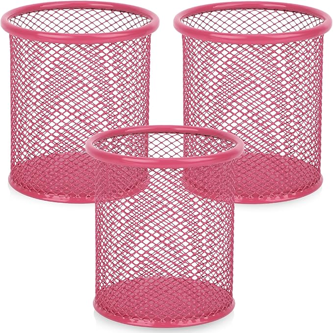 Segarty Pen Cup, 3 Pack Cute Dark Pink Pen Holder, Round Mesh Pencil Holder for Desk, Desktop Accessories Organizer for Office Supply, School, Home Storage, Makeup Brush Organization