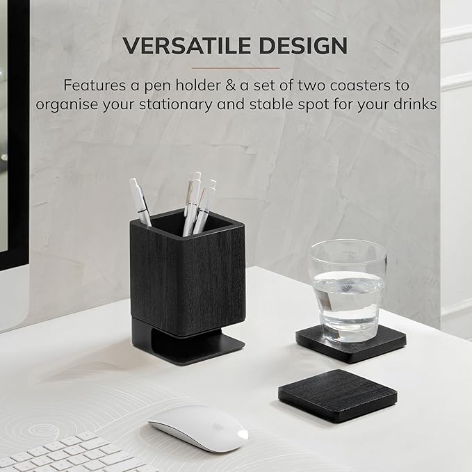 - Elegant Desk Accessories: Crafted from sustainable mango wood, this wooden pen cup and coasters set enhances office desk accessories with its sleek design, offering a refined touch to any office desk environment.