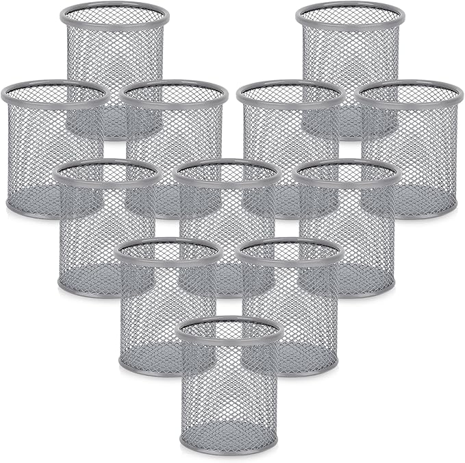 Segarty Pen Cup Holder for Desk, 12 Pack Round Silver Pen Holder, Wire Mesh Pencil Cups Containers Marker Organizer Set for Office Supplies, School, Desktop Accessories, Makeup Brush